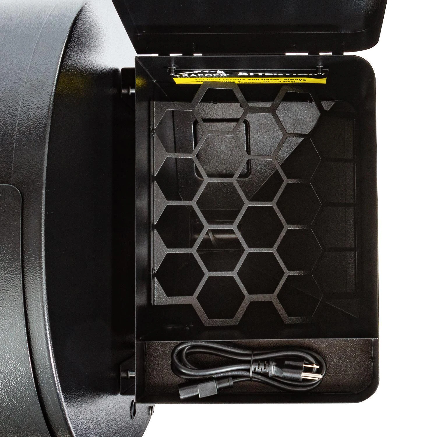 • Large capacity pellet hopper, holding up to 20 pounds of Traeger hardwood pellets. A hopper clean-out door lets you quickly empty contents for cleaning and swapping out flavors.